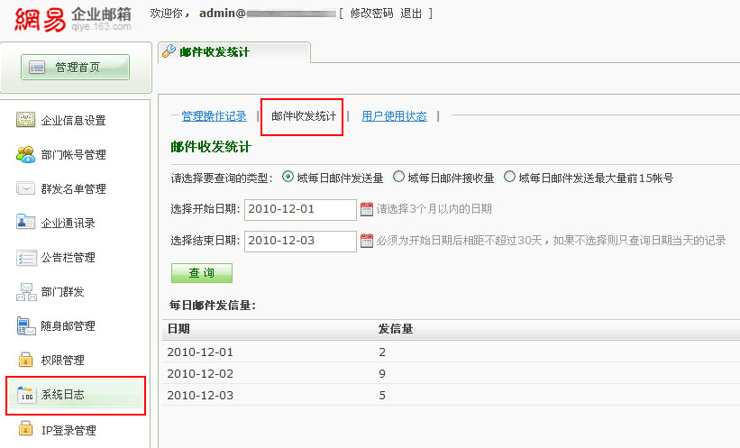 可查看最近3个月内,某段时间内整个企业的邮件发送量、接收量,并可查看每天发信量最大的前15位帐号,以及这些帐号的发信量。