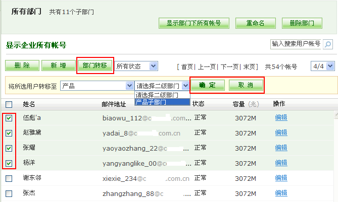更新后,管理员可以在管理后台的"部门帐号管理"处进行批量操作,同时将多个用户一次性转移至另一部门,示意如下: