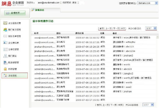 4、系统将按照管理员操作时间的先后顺序记录日志。可进行前后翻页来查看系统日志。从本功能推出之日起,管理员的各项操作将开始被记录,并且一直保留下去,不会被清除。
